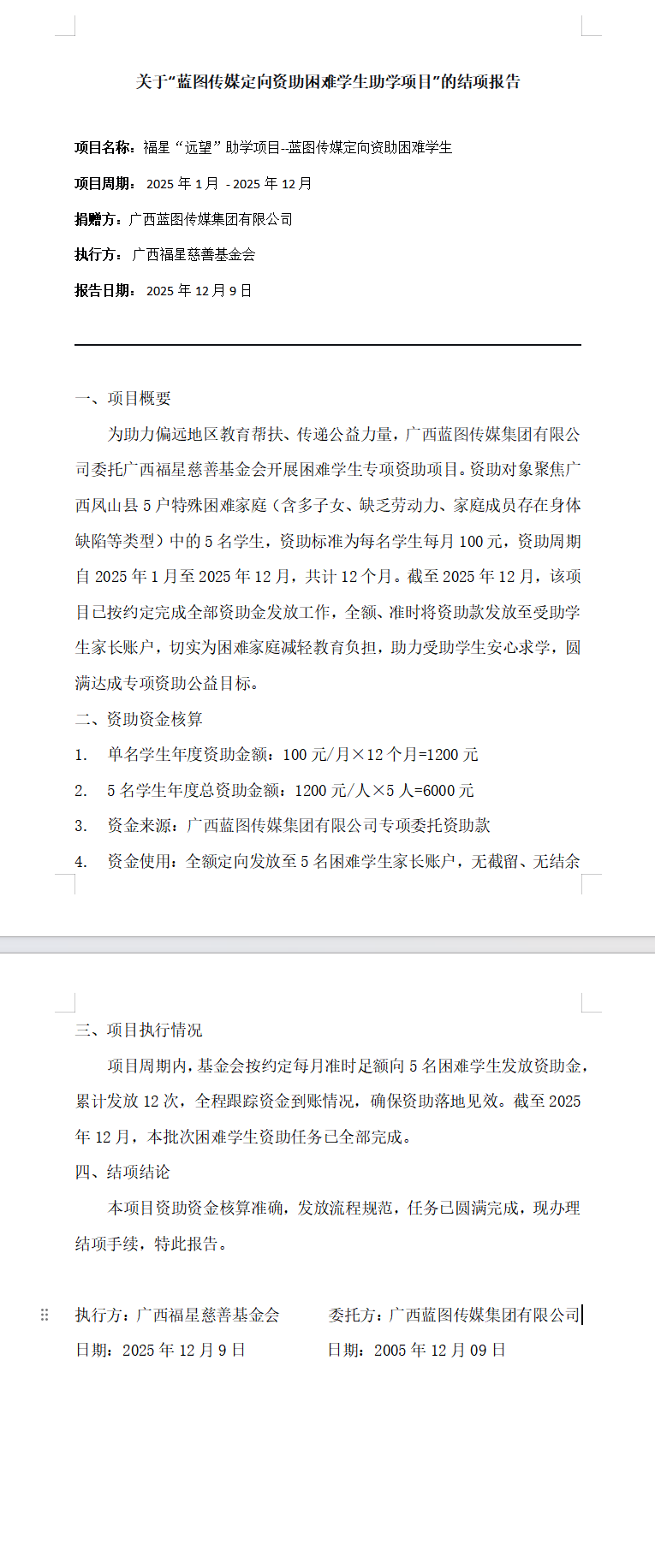 关于“蓝图传媒定向资助困难学生助学项目”的结项报告